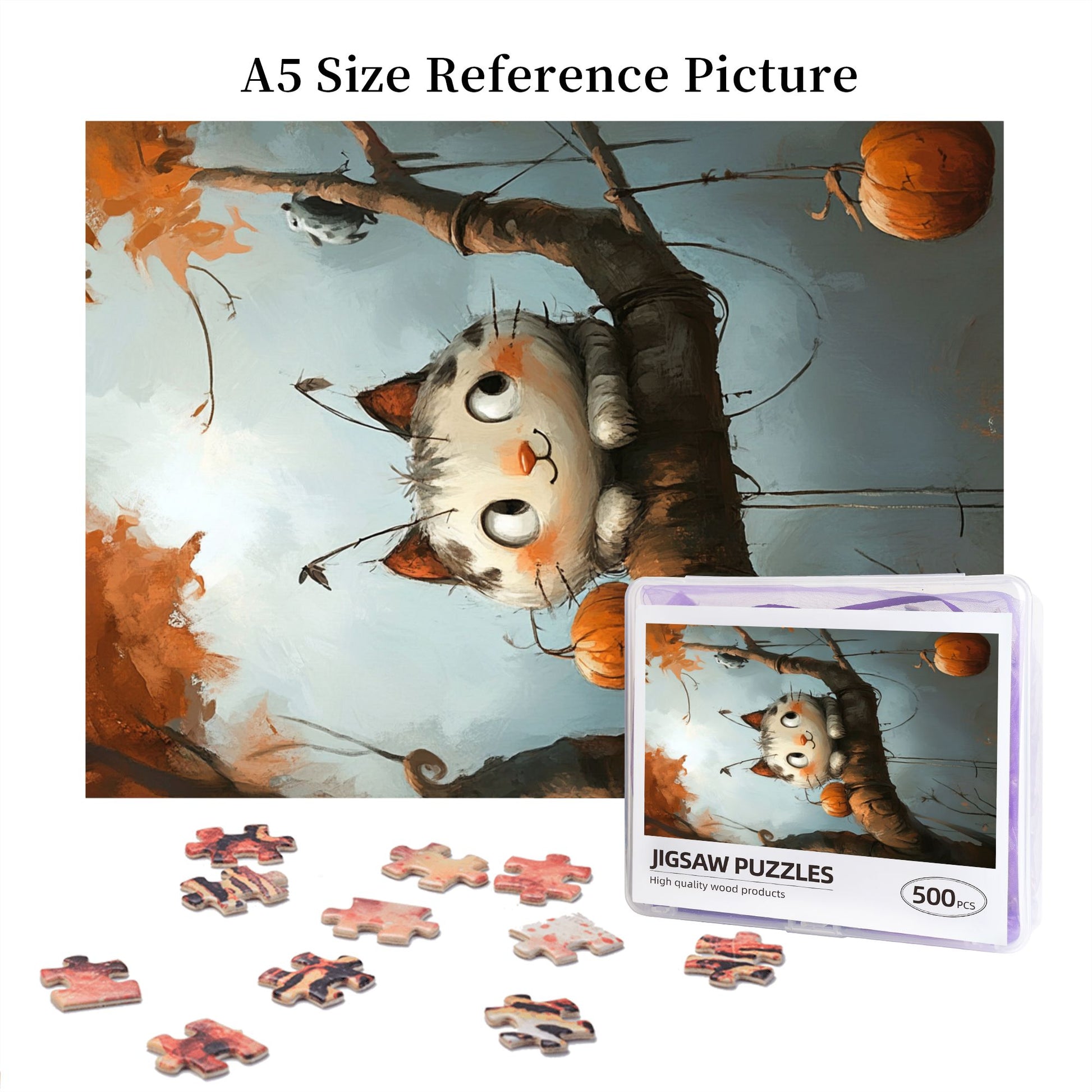 Step into a whimsical autumn scene with the Autumn Whimsy Cat Puzzle, featuring a charming cat perched on a tree branch surrounded by pumpkins and falling leaves. This delightful artwork brings the coziness of fall to your puzzle time, offering a fun and relaxing experience. Perfect for personal enjoyment or as a unique decorative piece.