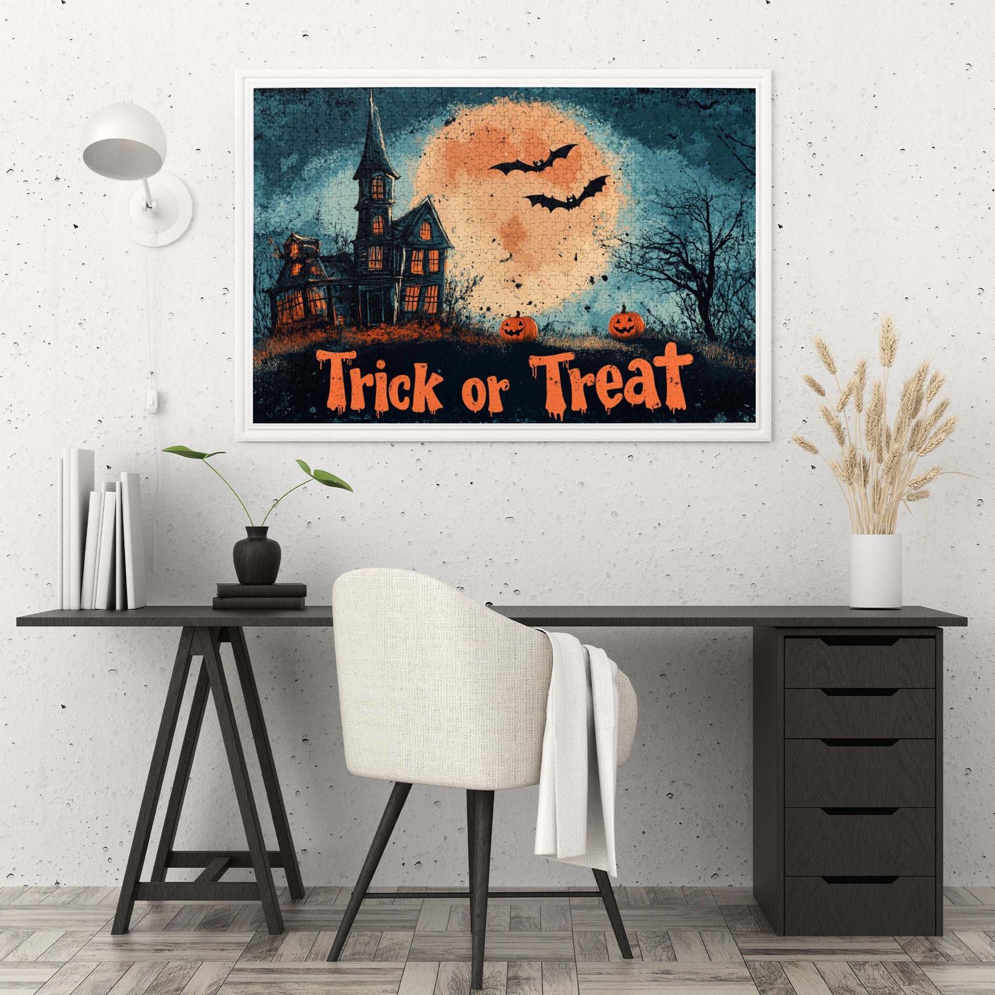 This puzzle captures the spooky spirit of Halloween with its “Trick or Treat” theme, featuring a haunted house, jack-o'-lanterns, bats, and a glowing full moon. Crafted from eco-friendly, high-quality wood, this puzzle offers a smooth and precise assembly experience. It’s perfect for family fun, festive decorations, or as a thoughtful gift for friends. Once completed, the puzzle measures 75cm x 50cm, making it an ideal Halloween-themed piece for display.